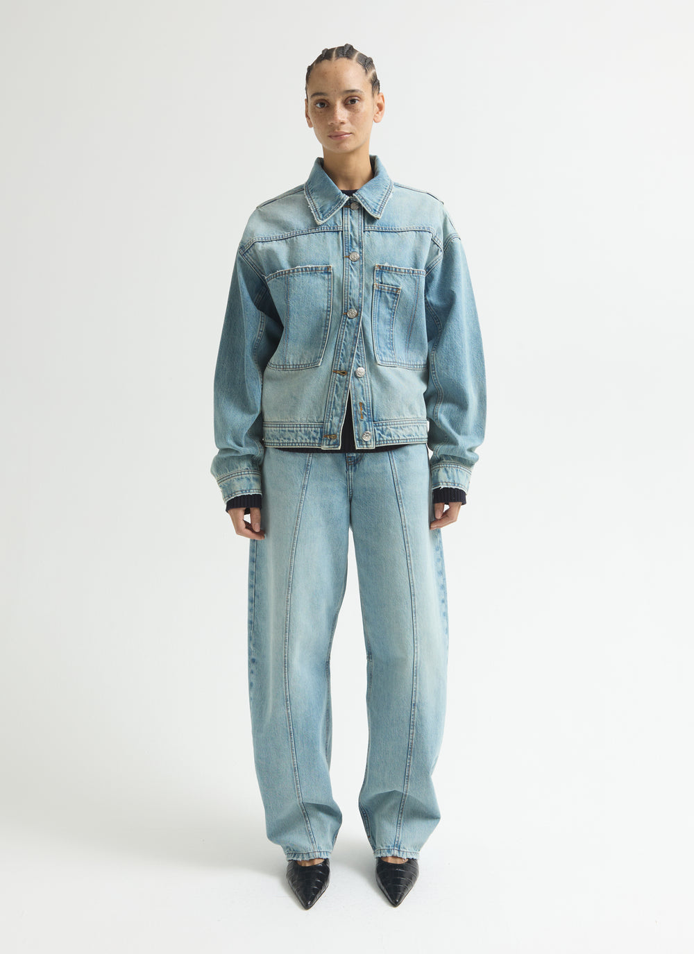 The Lido Jacket has an oversized fit with dropped shoulders, chest patch pockets, and fold-and-vent detailing at the back. Fastened with branded shanks. Cut from rigid Italian denim in 100% organic cotton and washed with a low-impact process that reduces water and chemical use. Produced in Paraguay by BDA.