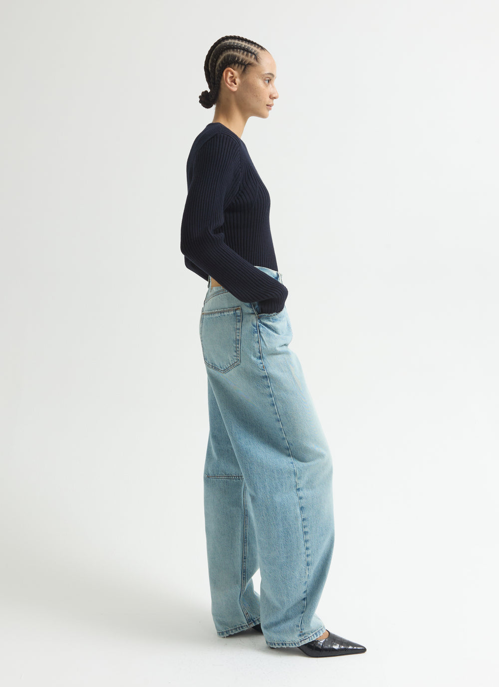 A mid-high rise jean with a zip fly and a full-length curved horseshoe leg, finished with front flat-seam detailing. Designed to pair with the Lido Jacket and fits true to size. Made with rigid Italian denim in 100% organic cotton, finished with a low-impact wash for a lighter footprint. Produced in Paraguay by BDA.