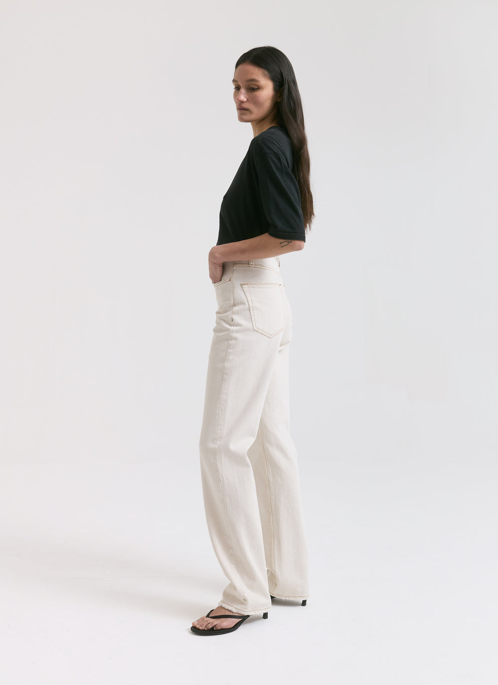 A high-rise jean with a button fly, slim through the thigh, and straight through the full-length leg. This style may feel snug at first but will soften and mould with wear. Size up for a looser fit. Made with Italian rigid denim in 100% organic cotton, finished with a low-impact wash for a lighter footprint. Produced in Paraguay by BDA.