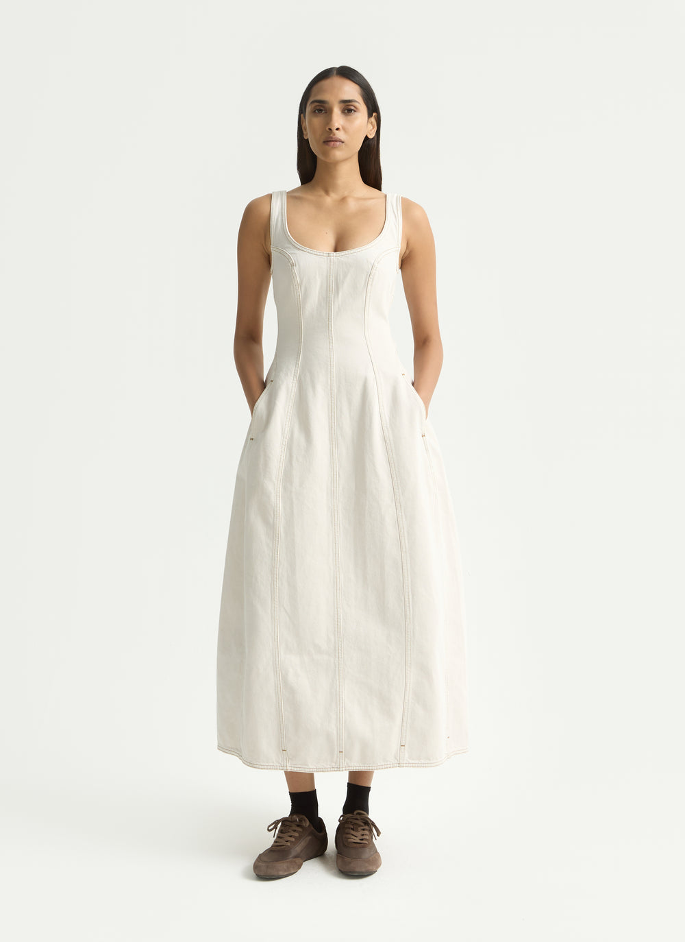 Our Cocoon Bustier dress has a fitted bust and waist through to an exaggerated cocooned shaped skirt. It features signature DALA seam detailing, with godet panels at the hips and is finished with a CB zip. Made from rigid Italian denim in 100% organic cotton and washed with a low-impact process that reduces water and chemical use. Produced in Paraguay by BDA.