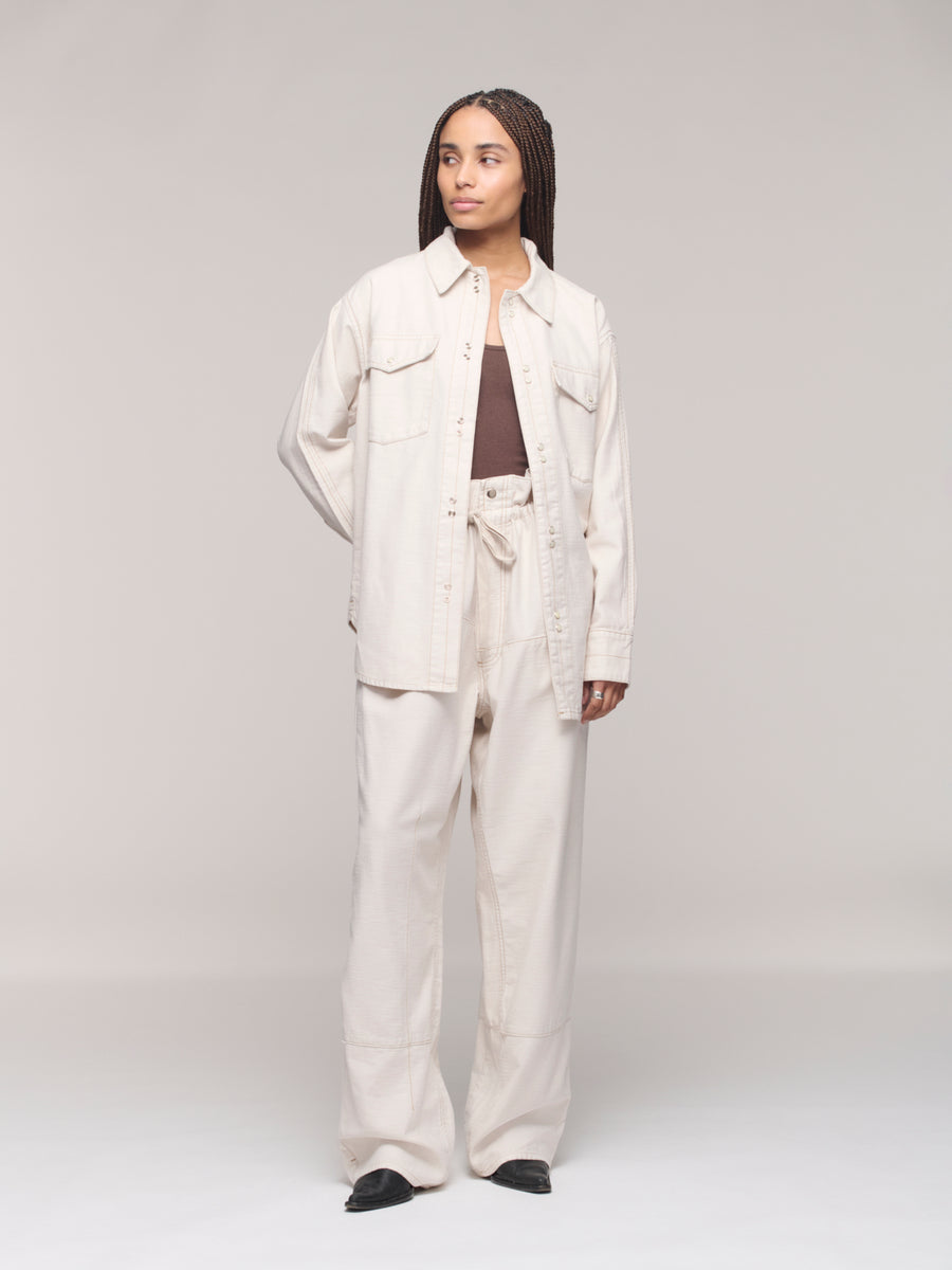 The Stack Shirt fits oversized with a full length sleeve, side splits at the seams and branded shank fastening. Cut from rigid Italian denim in 100% organic cotton and washed with a low-impact process that reduces water and chemical use. Produced in Paraguay by BDA.